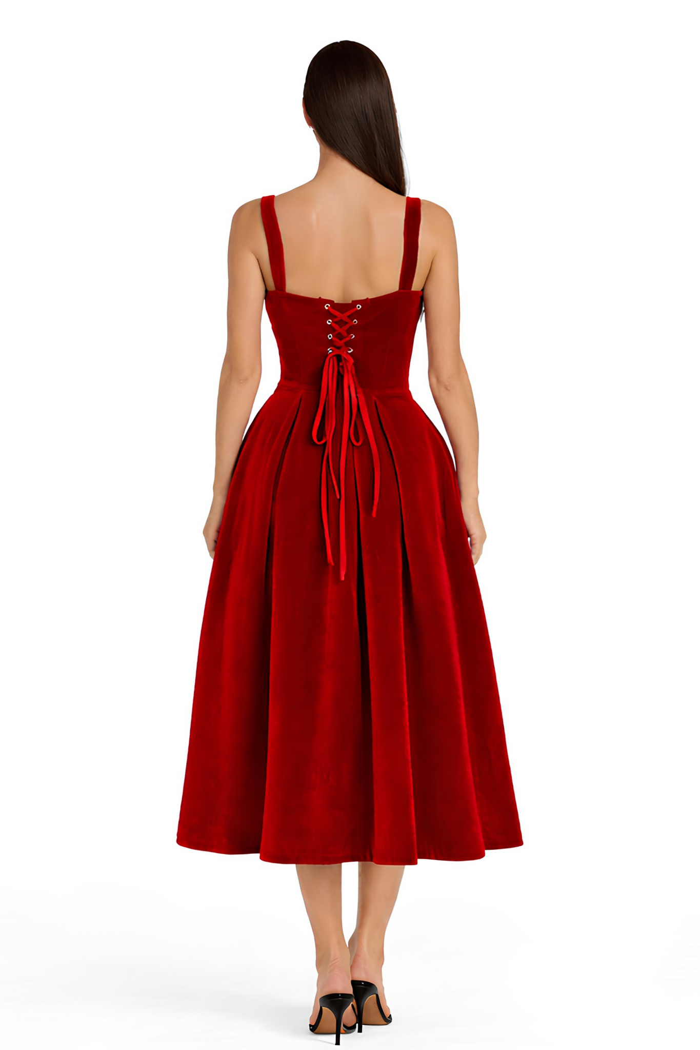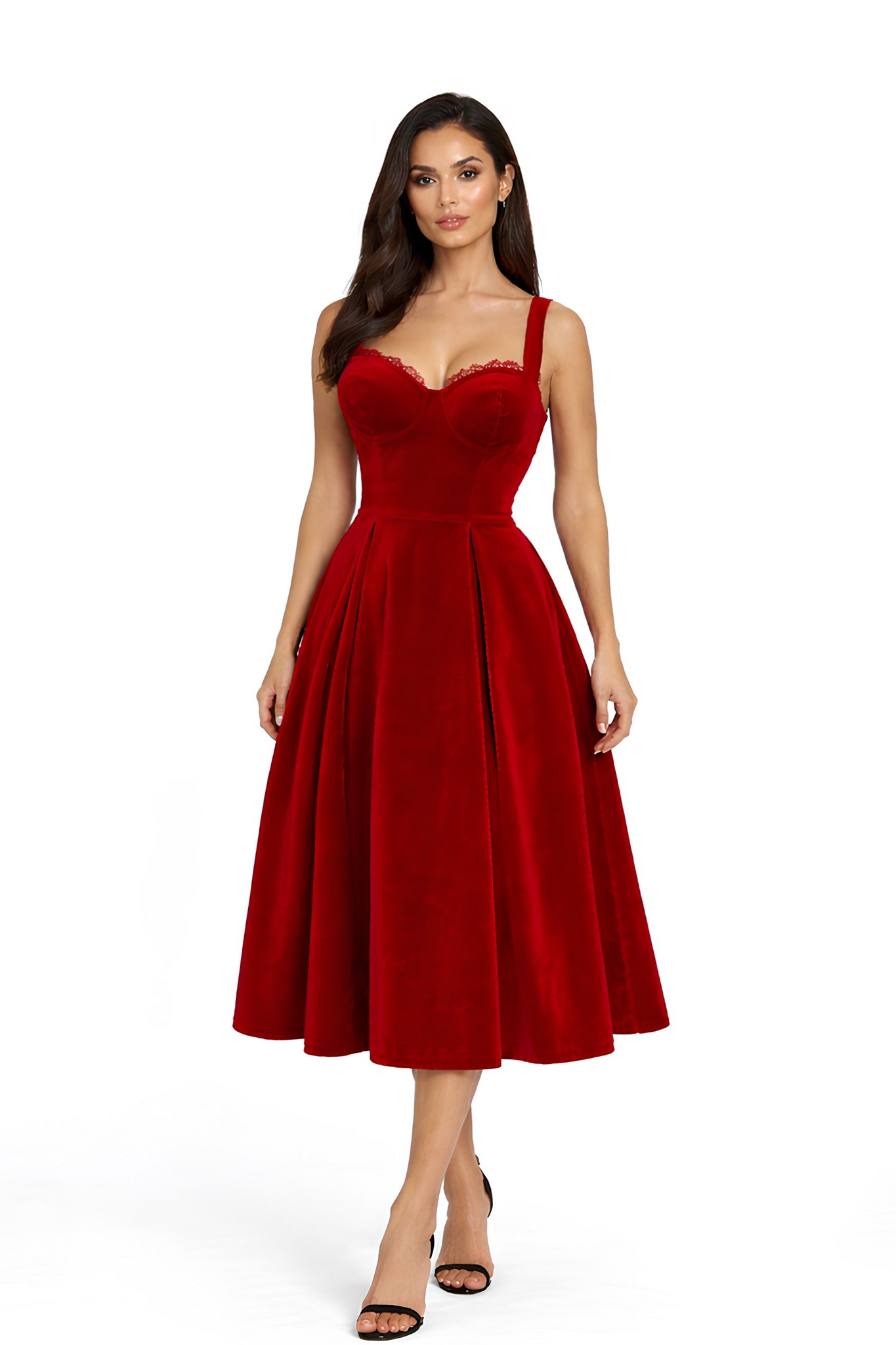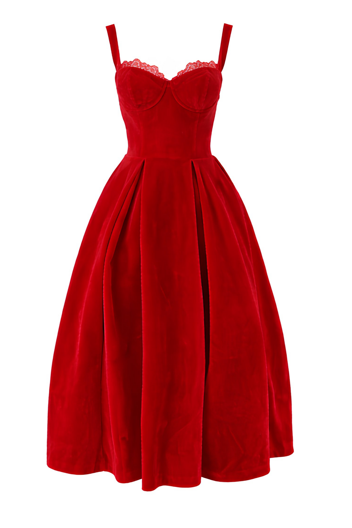 Crafted in luxurious red cotton velvet, this romantic statement dress is perfect for Valentine’s Day, evening wear, and special occasions.